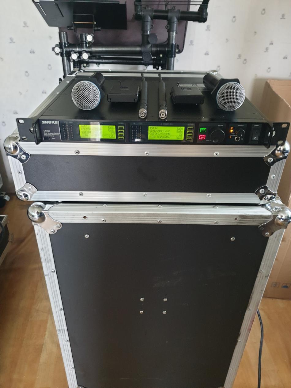 슈어UR4D무선마이크팝니다 J5(578~638) 핸드BETA58A 2개 벨트팩2개 안테나2개 전원케이블 상태깨끝하고이상없읍니다 가격300만원