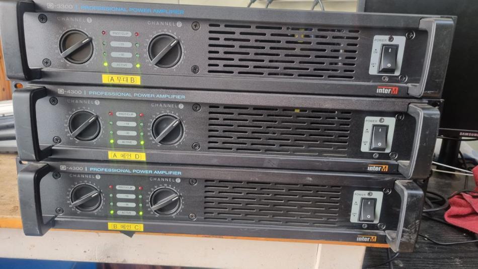 모두 한곳에 있던 파워엠프입니다상태 양호하고 동작 정확합니다.안산010-6346-26671. 인터엠 Q43004옴 채널당 1200W 2채널 ..